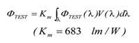 yaux,TEST (λ)為不點亮待測樣品,點亮輔助燈,在此系統下的光譜輻射計的讀值;yaux,REF (λ)則為不點亮參照標準燈,點亮輔助燈時,在此系統下的光譜輻射計讀值。從測得的ΦTEST (λ)(單位:W/奈米)總分光輻射通量,可使用公式(3)計算總光通量 ΦTEST (單位:流明)。