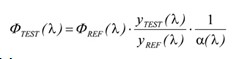 公式(2)中,yTEST (λ)為待測樣品在此系統下的光譜輻射計的讀值、yREF(λ)為參照標準燈在此系統下的光譜輻射計的讀值,α(λ)則為自吸收因子。