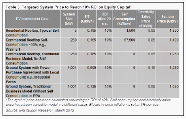 在FIT調(diào)整之后,IHS iSuppli公司的計(jì)算結(jié)果顯示,如果系統(tǒng)價(jià)格為1850歐元/kW,即使取消自我消費(fèi)獎(jiǎng)勵(lì),德國住宅系統(tǒng)仍能達(dá)到10%的股本(20%)投資回報(bào)率。由于德國市場的價(jià)格已經(jīng)降到這樣的水平,住宅領(lǐng)域?qū)⒗^續(xù)提供有吸引力的投資條件,盡管政府降低FIT。