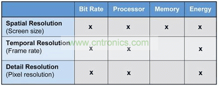 表 1 給出了不同視頻編碼參數(shù)對(duì)解碼設(shè)備所需資源選擇的大致影響。該表專(zhuān)門(mén)對(duì)采用運(yùn)動(dòng)補(bǔ)償與離散余弦變換 (DCT) 技術(shù)實(shí)現(xiàn)視頻壓縮的基于塊的視頻編解碼器進(jìn)行了分析。