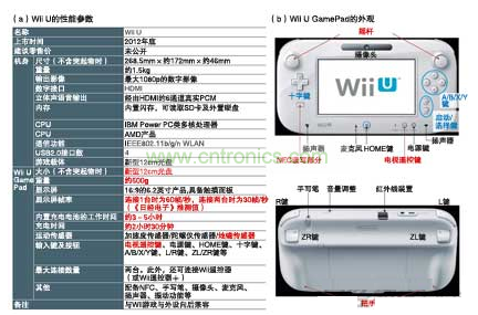 在E3上公開了Wii U的具體性能參數。例如,判明了平板型控制器“Wii U GamePad”的尺寸、重量及各種按鈕的配置等。另外,(b)的紅字部分指新追加或者大幅變更的部材,藍字部分指配置位置有很大變化的部材。
