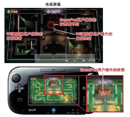 在Wii U上,只有使用GamePad的用戶,才能在看著與電視上顯示內容不同的信息玩游戲。比如,在打妖怪的迷你游戲“Luigi’s Ghost Mansion”中,手拿GamePad的用戶操作妖怪,手拿Wii遙控器的4名用戶負責打退妖怪。此時,手拿GamePad的用戶可在該屏幕上看到負責打妖怪的卡通人物的位置,而打妖怪的人卻看不到妖怪的位置。