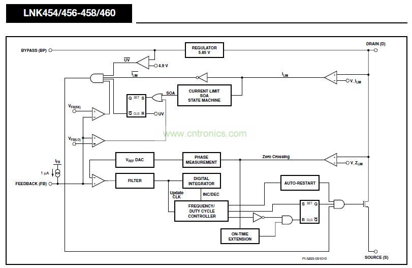 LinkSwitch-PL在一個器件上集成了一個高壓功率MOSFET開關及一個電源控制器。該IC器件提供單級功率因數校正和LED電流控制。LinkSwitch-PL控制器包括一個振蕩器、反饋(檢測及邏輯)電路、5.85 V穩壓器、遲滯過熱保護、頻率抖動、逐周期限流、環路補償電路、自動重啟動、開關導通時間延長、功率因數以及恒流控制電路。