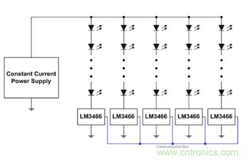 在本應用中,LM3466 集成電路可互相通信,確保恒定電流電源所強加的輸入電流能夠在各串之間進行平均分配。線性穩壓器會吸收 LED 堆棧正向電壓的任何差異。