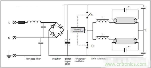 熒光燈的調光(1-10V)熒光燈的調光是在高頻電子鎮流器的基礎上研發出來的。下面是高頻電子鎮流器的線路圖: