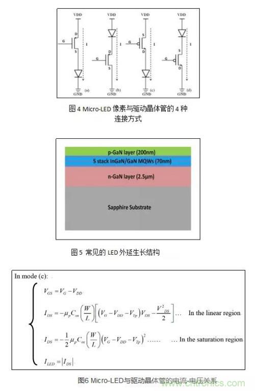 圖4(a)中Micro-LED像素連接在N型驅(qū)動晶體管的源極(Source)。由外延生長(Epitaxial Growth)、制備工藝、及器件老化所產(chǎn)生的不均勻性所導(dǎo)致的Micro-LED電學(xué)特性的不均勻性將會直接影響驅(qū)動晶體管的VGS,從而造成顯示圖像的不均勻。而圖4(c)中的Micro-LED像素連接在P型驅(qū)動晶體管的漏極(Drain),可以避免上述影響,其電流-電壓關(guān)系圖6所示。因此,有P管像素電路驅(qū)動Micro-LED較為適宜。