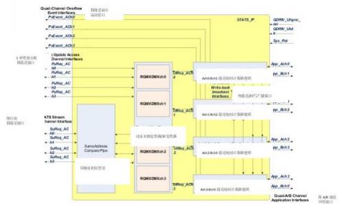 SACOMP模塊圖包含兩個管道階段,其中一個用于通過比較將同一時鐘周期上的所有四條通道進行壓縮(SACOMP_ChN-to-All),另一個用于對單一通道上的同一地址進行雙向(突發(fā)2)比較(SACOMP_B2BChN)。當(dāng)兩條或更多條通道在指定的時間實例中為同一地址時,優(yōu)先性最高的通道積累地址相同的通道上出現(xiàn)的數(shù)據(jù),而所有其他優(yōu)先性較低、地址相同的通道都將失效。這確保了單一統(tǒng)計請求覆蓋所有地址相同的通道,從而預(yù)防出現(xiàn)任何數(shù)據(jù)一致性問題。比較和積累算法對所有可能的情況進行快速評估。此外,在單根通道上,如果有同一存儲位置的雙向統(tǒng)計更新請求,則最新請求失效,其數(shù)據(jù)通過之前發(fā)生的請求積累。這樣能夠確保任何同一地址位置的雙向存取不會在QDR-IV存儲設(shè)備定義的讀取延遲中發(fā)生。圖2所示的請求-復(fù)用– 解復(fù)用(RQMXDMXChn)區(qū)塊接收對應(yīng)通道數(shù)的處理器更新請求和統(tǒng)計更新請求。由于處理器更新請求的間隔時間固定,因此RQMXDMXchN選擇對應(yīng)下一個時鐘服務(wù)的處理器請求,并且通過“請求就緒”回壓信號停止統(tǒng)計請求。在開始處理每個一秒更新請求后,RQMXDMXchN停止配置時鐘數(shù)(默認為10)的處理器請求通道以確保不會提供連續(xù)的一秒更新請求服務(wù)。停止信號發(fā)送至NPU,確保在回壓信號失效前不會產(chǎn)生新的請求。該機制能夠在不堵塞這一設(shè)計的情況下處理統(tǒng)計和處理器請求。