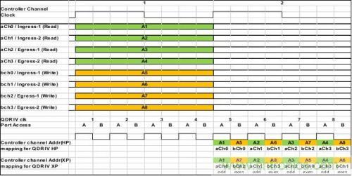 統(tǒng)計流四通道和一秒(處理器)更新四通道接口作為應(yīng)用通道。QDR IV控制器采用帶有為QDR IV端口A和端口B定義的專用四通道端口界面的4:1/1:4通道復(fù)用/解復(fù)用功能。QDR-IV控制器以固定順序?qū)νǖ肋M行復(fù)用和解復(fù)用,應(yīng)用端和以4X時鐘頻率運行的QDR IV設(shè)備端之間的順序為ch0、ch1、ch2和ch3。圖3為所假設(shè)的QDR-IV控制器順序和建議的QDR IV HP統(tǒng)計計數(shù)器解決方案和QDR IV XP統(tǒng)計計數(shù)器解決方案應(yīng)用通道映射。