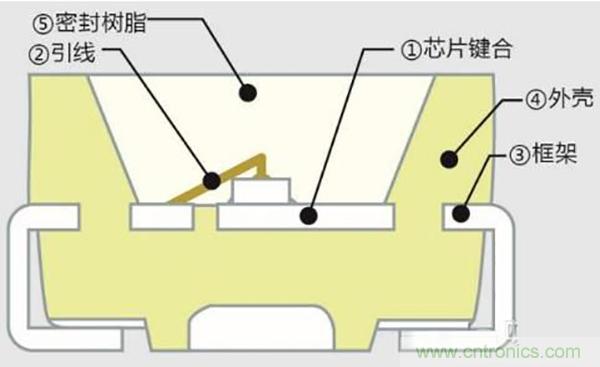 一直以來,存在元件晶片鍵合*2)所用的焊膏部位變黑導(dǎo)致LED發(fā)光強(qiáng)度降低的問題。但是,新開發(fā)LED的結(jié)構(gòu)與部件,羅姆采用從元件到封裝的垂直統(tǒng)合型生產(chǎn)體制,芯片鍵合、引線、框架每個部位均可采取抗硫化措施。
