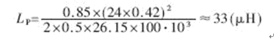 設PWM控制最大占空比Dmax=42%,如果初級繞組的電感量設計得大,則流過功率開關管和輸出濾波電容的電流峰值小,但由于電流上升斜率小,電路抗干擾能力差且功率開關管開通電流大;電感量小時,電流脈動大,沖擊電流大。因此設計電感電流工作在連續工作狀態,輕負載時取額定功率的一半,由(2)式可知: