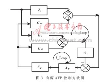 AVP有源控制為雙環(huán)控制,其基本原理如圖2所示。通過檢測(cè)電感電流,根據(jù)降壓要求相應(yīng)調(diào)節(jié)輸出電壓的基準(zhǔn)。輸出電壓跟隨基準(zhǔn)電壓而實(shí)現(xiàn)AVP控制。圖3為AVP有源控制的方塊圖,假設(shè)電流環(huán)增益為Ti,電壓環(huán)增益為Tv,則: