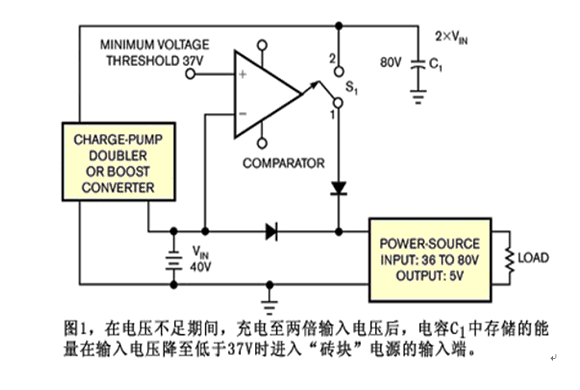 應記住,電容存儲的能量以指數(shù)增加,而電容的電壓線性增加。倍增器把C1充電至兩倍輸入電壓或至少為80V。即便假定每10s出現(xiàn)一次5ms電壓不足,用于充電200mF的電流仍僅約為3mA。比較器觀察輸入電壓,并且一旦它降至低于37V,開關S1就會關閉,而來自C1的能量向“磚塊”電源放電。