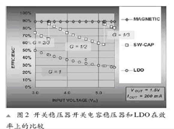隨著VIN的增長(zhǎng),由轉(zhuǎn)換器產(chǎn)生的VIN和VOUT 間的增量增長(zhǎng)引起功率消耗的增長(zhǎng)和效率的下降。解決這個(gè)問(wèn)題的一個(gè)方式是轉(zhuǎn)變成一個(gè)更高的效率增益,就像給汽車(chē)替換齒輪一樣。圖2顯示了一個(gè)開(kāi)關(guān)電容器降壓穩(wěn)壓器,一個(gè)LDO及一個(gè)開(kāi)關(guān)電容器的效率曲線。開(kāi)關(guān)電容器具有一個(gè)模擬增益控制和增益變化以保持一個(gè)給定負(fù)載效率的持續(xù)性。開(kāi)關(guān)電容器并具有離散增益步驟,由VOUT/(增益 *VIN)與離散增益來(lái)決定效率的高低。一個(gè)LDO僅有1的增益及三者中最低的效率。開(kāi)關(guān)電容器(SC)穩(wěn)壓器則有三個(gè)不同的電壓增益(2/3,1/2和1/3)。我們可以看到,開(kāi)關(guān)電容穩(wěn)壓器隨著VIN 的增長(zhǎng),電壓增益從2/3轉(zhuǎn)到1/2以及從1/2到1/3,因此整個(gè)負(fù)載范圍的效率達(dá)到最大化。這就帶來(lái)了在Li-ion 范圍上(3.4V到3.8V)80%的效率。在相同應(yīng)用中的一個(gè)LDO僅能達(dá)到50%的效率。根據(jù)電感器種類(lèi),一個(gè)典型的開(kāi)關(guān)穩(wěn)壓器大約具有88-90%的效率。