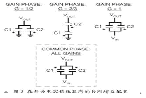開(kāi)關(guān)電容穩(wěn)壓器的更多增益可能會(huì)增加一點(diǎn)點(diǎn)效率,但是卻要增加更多外部電容器和內(nèi)部功率FET,從而增加成本,同時(shí)也加大了解決方案的尺寸。上述的增益可以通過(guò)兩個(gè)外部電容器或快速電容器(CFLY)來(lái)取得。這些電容器用于存儲(chǔ)電荷并將電荷從VIN 傳輸?shù)?VOUT。除了快速電容(CFLY) ,我們還需要一個(gè)輸入電容器(CIN),和一個(gè)輸出電容器(COUT),輸入電容器(CIN)指示出電壓紋波,而輸出電容器(COUT)控制輸出電壓紋波。根據(jù)VIN 和 VOUT 可接受的紋波取值,CIN 和COUT 的典型值范圍是從1mF 到10mF 。CFLY 的數(shù)量通常比COUT 少。外部電容器(CFLY)通過(guò)內(nèi)部的功率FET在不同的配置中連接到芯片。圖3顯示出2/3, 1/2和1增益的不同配置。電容器C1和C2是快速電容器或CFLY。CIN和COUT已被刪除以達(dá)到簡(jiǎn)化目的。如圖所示,一個(gè)增益通過(guò)兩相位間的交替變化來(lái)取得,其中包括充電相位或普通相位和放電相位。在不同的增益之間具有一個(gè)共同相位以便在增益間達(dá)到完美躍遷。我們可以通過(guò)共同相位,根據(jù)需要隨時(shí)進(jìn)行增益躍遷。一個(gè)開(kāi)關(guān)電容穩(wěn)壓器在芯片上可能有一個(gè)到2個(gè)功率FET。然而,一個(gè)開(kāi)關(guān)電容穩(wěn)壓器可能在芯片上任何位置設(shè)有4個(gè)到9個(gè)或者更多的功率FET(根據(jù)離散電壓增益的數(shù)量)。這就限制了在既定的裸片尺寸下,開(kāi)關(guān)電容穩(wěn)壓器的輸出電流性能。圖4在開(kāi)關(guān)、開(kāi)關(guān)電容器和線性穩(wěn)壓器間的負(fù)載性能、效率和尺寸上進(jìn)行了比較。
