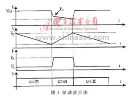 由于加速電容C4的作用,實(shí)際工作時(shí),MOSFET的柵-源極輸入脈沖的下降沿非常陡,且又由于柵-源極輸入電容的作用,使VGS 波形具有一定的斜率,這有利于MOSFET的飽和導(dǎo)通。圖4為驅(qū)動(dòng)波形。