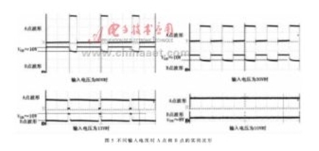 圖5為當(dāng)輸出電壓為10V、電流為2A時(shí),在不同輸入電壓狀態(tài)下,圖3中A點(diǎn)和B點(diǎn)的實(shí)測波形。由圖5可知,當(dāng)輸入電壓為13V時(shí),MOSFET關(guān)斷時(shí)間很短,當(dāng)輸入電壓為10V時(shí),MOSFET則一直導(dǎo)通。