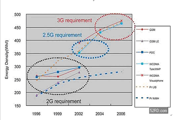(圖二) 3G行動電話對電池能量密度的規(guī)格需求