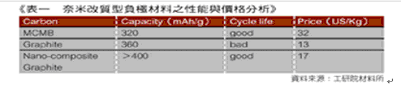 (表一) 納米改質(zhì)型負(fù)極材料之性能與價格分析