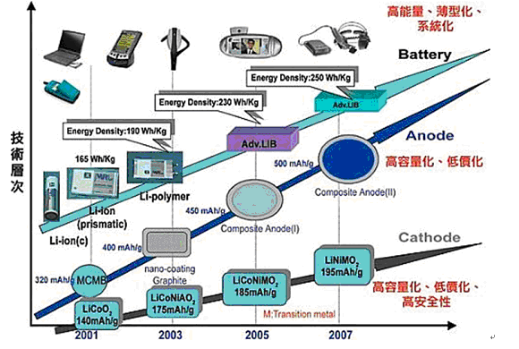 鋰二次電池雖然已廣泛使用于3C產(chǎn)品上,然而隨著筆記型電腦使用1GHz CPU而增加耗電量,以及LCD螢?zāi)怀叽缂哟蟆⒔馕龆忍岣摺⑹褂酶呷萘坑驳癉VD-ROM等趨勢,未來筆記型電腦整體功率消耗明顯提高,因此對鋰電池主要的技術(shù)提升需求,包括提升電池能量密度、降低重量與智慧型電源管理。未來行動電話從2G提升至3G時,不論是GSM、WCDMA等系統(tǒng),所需要的電池能量密度都需要明顯的增加。目前薄型鋰電池系統(tǒng)的重量能量密度雖有顯著的提升,但主要是罐體外殼的輕量化,在電極材料的性能提升上,進(jìn)展較少。針對3G所強(qiáng)調(diào)的高體積能量密度>420 Wh/L要求,目前薄型鋰電池的體積能量密度(340~360 Wh/L)仍無法符合其規(guī)格目標(biāo)。未來各種多功能的手錶(Multifunctional Watch),將具有Phone、DSC、MP3等功能,此時對能量密度高且薄型化鋰電池的需求更加迫切,另一方面3G行動電話與結(jié)合電腦、PDA、行動電話等功能的行動資訊與通訊終端產(chǎn)品(Mobile IA),將大量地被使用,對具有高能量密度的鋰電池同樣迫切需求,如(圖二)。因此開發(fā)高容量及高功率的納米級鋰電池材料,并應(yīng)用于新世代的納米鋰電池上,是全世界鋰電池業(yè)者目前最重要需突破的目標(biāo)。