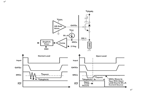 在“關閉”狀態下監控開路負載故障為系統提供了負載完整性信息。當開關完全處于“關閉”狀態下時,通過監控外部功率 FET 的電源電壓,就可以實現對每一條通道開路負載故障的檢測。一個內部電源激活一個流經負載到接地的小恒定電流,并且使開路負載檢測閾值以下的 SRCx 節點發生偏置。