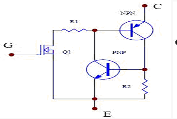 IGBT 有一定抗過電流能力,但必須注意防止過電流損壞。IGBT 復合器件內有一個寄生晶閘管,所以有擎住效應。圖5 為一個IGBT 的等效電路,在規定的漏極電流范圍內,NPN 的正偏壓不足以使NPN 晶體管導通,當漏極電流大到一定程度時,這個正偏壓足以使NPN 晶體管開通,進而使NPN 和PNP 晶體管處于飽和狀態,于是寄生晶閘管開通,門極失去了控制作用,便發生了擎住效應。IGBT 發生擎住效應后,漏極電流過大造成了過高的功耗,最后導致器件的損壞。
