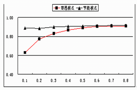 針對電源部分的損耗,戶外電源的工作模式和室內電源是一樣的,正常情況下為均流工作模式。市電正常時模塊負載率較低,電源系統大多數沒有工作在系統最佳效率區間,因此可以采用電源模塊休眠技術根據系統負載狀態,動態調整工作模塊數量,使系統始終工作在最佳效率區間,從而降低系統的能耗。圖1表示了電源系統在普通工作模式下和節能模式下的系統典型效率比較。從圖1可看出,采用休眠節能模式,電源系統的效率在整個負載范圍內基本保持不變,有效的降低了電源系統在低負載條件下的能耗。另一方面,對于戶外電源來說,電源系統效率提高會降低設備倉的發熱量,降低設備倉的溫度。