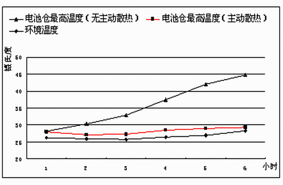 因此戶外電源設計中針對電池倉的環境控制非常關鍵。尤其在高溫環境中要有針對性的散熱措施,研究表明,傳統的自然開孔散熱難以滿足電池的應用要求。在傳統的自然開孔散熱條件下,雖然蓄電池自身發熱量較小,但隨著環境溫度的升高,在蓄電池倉中的熱累積會逐步的升高電池倉的溫度,在太陽照射的條件下情況更為嚴重。如圖6所示,在自然散熱條件下(倉內無主動散熱措施),電池倉內溫度會遠高于環境溫度。在同樣的條件下,采用主動散熱技術,電池倉內溫度基本接近于環境溫度,電池工作條件會得到極大改善。根據此項研究結果,艾默生開發了電池倉獨立風道散熱技術,保證了電池倉的充分散熱,極大的改善了電池工作溫度,提高了電池壽命。