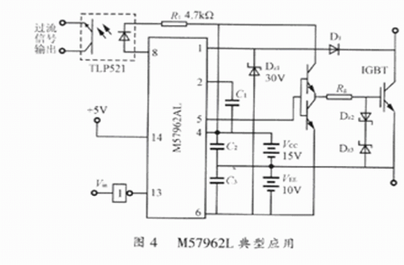 典型應(yīng)用圖如圖4所示。當驅(qū)動信號通過腳14和腳13時,經(jīng)過高速光耦隔離,由M57962AL內(nèi)置接口電路傳輸至功率放大極,在M57962AL的腳5產(chǎn)生+15V開柵和一10V關(guān)柵電壓,驅(qū)動IGBT通斷。當腳1檢測到電壓為7V時,模塊認定電路短路,立即通過光耦輸出關(guān)斷信號,使腳5輸出低電平,從而將IGBT的G—E兩端置于負向偏置,可靠關(guān)斷。同時,輸出誤差信號使故障輸出端(腳8)為低電平,從而驅(qū)動外接的保護電路工作。延時2~3s后,若檢測到腳13為高電平,則M57962AL恢復(fù)工作。穩(wěn)壓管DZ1用于防止D1擊穿而損壞M57962AL,Rg為限流電阻,DZ2和DZ3起限幅作用,以確保可靠通斷。