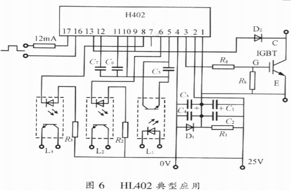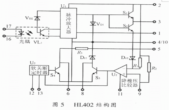 HL402是17腳單列直插式結(jié)構(gòu),內(nèi)置有靜電屏蔽層的高速光耦合器實現(xiàn)信號隔離,抗干擾能力強,響應(yīng)速度快,隔離電壓高。它具有對IGBT進行降柵壓、軟關(guān)斷雙重保護功能,在軟關(guān)斷及降柵壓的同時能輸出報警信號,實現(xiàn)封鎖脈沖或分斷主回路的保護。它輸出驅(qū)動電壓幅值高,正向驅(qū)動電壓可達15~17V,負向偏置電壓可達10~12V,因而可用來直接驅(qū)動容量為400A/600V及300A/1200V以下的IGBT。