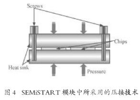SEMiSTART模塊中,用于芯片的連接技術基于壓接技術,兩個晶閘管芯片反并聯(lián)連接并被壓在兩個散熱器之間。