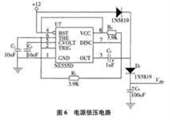 電源倍壓電路如圖6所示,NE555定時器工作于多諧振蕩器模式,于引腳3產(chǎn)生幅值等于NE555的供電電壓,頻率為1/0.7(R2+2R1)C1的矩形波。C3、C4,Dl和D2構(gòu)成電荷泵電路。當NE555引腳3輸出高電平時,由于電容電壓不能突變,C3正極電壓為24V或接近24V,并通過D2向C4充電,使C4電壓為24V或接近24V。由于受電路的工作效率、二極管D1和D2上的正向電壓降以及負載能力的限制,使得系統(tǒng)輸出電壓低于供電電壓的2倍,即供電電壓為12V時,輸出電壓低于24V,當供電電源為12V時,倍壓電源電壓約為22.9V,大于Vdb1(22.74V),可以滿足需要。
