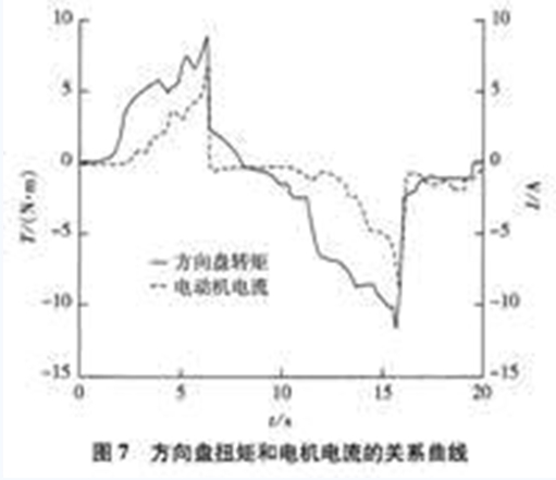 根據(jù)電動轉(zhuǎn)向控制系統(tǒng)對穩(wěn)定性和跟蹤性的需要,采用最優(yōu)H二控制器編制電動轉(zhuǎn)向系統(tǒng)控制程序,并在汽車電動轉(zhuǎn)向試驗臺上進行臺架模擬試驗,車速信號用模擬車速傳感器發(fā)出的脈沖信號代替網(wǎng)。圖7為中等車速轉(zhuǎn)向助力時,測量的方向盤轉(zhuǎn)矩(T)和助力電動機電流(I)變化曲線。從圖7中可以看出,在轉(zhuǎn)向過程中,助力電動機電流隨著方向盤轉(zhuǎn)矩的變化而變化,電動機電流的變化趨勢和方向盤轉(zhuǎn)矩的變化趨勢相吻合,表明電動機的助力轉(zhuǎn)矩對方向盤轉(zhuǎn)矩有良好的跟蹤性能。轉(zhuǎn)向操作時,無助力滯后感,轉(zhuǎn)向平穩(wěn),表明轉(zhuǎn)向系統(tǒng)具有良好的跟蹤性能和操縱穩(wěn)定性。