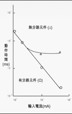 由圖6得知,無旁路元件時,即使增加輸入電流,光電流也受偏置電阻限制,動作時間可處于飽和狀態。對此,當有分路元件時,出現動作時間跟隨輸入電流量的情況,也可適應高速動作的需求。