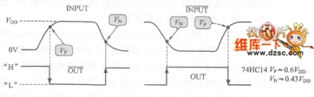 通常CMOS數(shù)字IC的閾值電壓(區(qū)別L和H的電壓電平)VT,只是一點,圖1表示具有施密特觸發(fā)電路的反相電路、74HC14的閾值電壓。施密特觸發(fā)電路具有高電平閾值Vp和低電平閾值Vn,閾值間具有磁滯電壓VH,VH為Vp-VN。即VP以下的輸人電平可被確定邏輯輸出;磁滯電壓VH,以下時,即使有噪聲,輸出電平也不變化。因此,具有施密特輸人的數(shù)字IC電路,即使加上變化緩慢的信號,因噪聲等引起輸出電平翻轉(zhuǎn)的危險也會變少。在數(shù)字電路的輸人電路中插入RC低通濾波器,可去掉輸人信號中含有的噪聲,整形輸出波形。