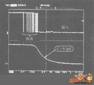圖1是稱為限位開關(guān)的微型開關(guān)的振蕩波形圖。機(jī)械觸點的開關(guān)由于按壓方法、時間不同會發(fā)生各種各樣的振蕩,此時的時間、波形也各種各樣,這里表示了最長時間的振蕩的例子。