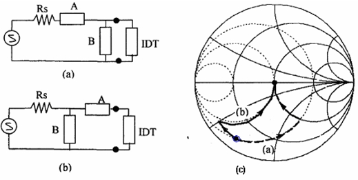 圖 1 二種簡單匹配電路方案(a)、(b) 及對應(yīng)的Smith 圓圖路徑(c)
