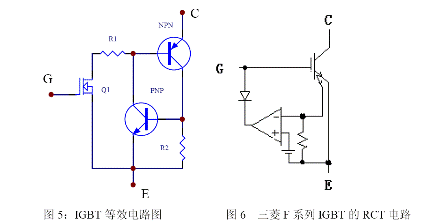 IGBT 有一定抗過電流能力,但必須注意防止過電流損壞。IGBT 復(fù)合器件內(nèi)有一個寄生晶閘管,所以有擎住效應(yīng)。圖5 為一個IGBT 的等效電路,在規(guī)定的漏極電流范圍內(nèi),NPN 的正偏壓不足以使NPN 晶體管導(dǎo)通,當(dāng)漏極電流大到一定程度時,這個正偏壓足以使NPN 晶體管開通,進(jìn)而使NPN 和PNP 晶體管處于飽和狀態(tài),于是寄生晶閘管開通,門極失去了控制作用,便發(fā)生了擎住效應(yīng)。IGBT 發(fā)生擎住效應(yīng)后,漏極電流過大造成了過高的功耗,最后導(dǎo)致器件的損壞。