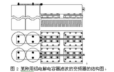 從上述兩電容器的參數(shù)可以明顯看到:與鋁電解電容器相比,ESR、最大有效值電流、寄生電感、浪涌電壓/額定電壓的比值、浪涌電流均明顯優(yōu)于鋁電解電容器,還有一個(gè)重要因素就是薄膜電容器的壽命是鋁電解電容器所無法相比的。如某種用鋁電解電容器濾波的變頻器的結(jié)構(gòu)如圖2。