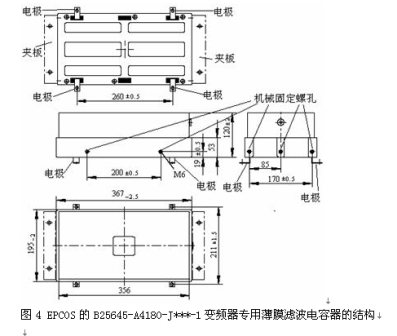 以EPCOS的B25645-A4180-J***-1變頻器專用薄膜濾波電容器的結(jié)構(gòu)為例,如圖4。電容器的引出端為銅板,裝配方式可以是將電極用螺栓固定在直流母線板的正、負(fù)極,實(shí)現(xiàn)電氣連接,這樣的電氣連接電容器與直流母線所包圍的空間將非常小,因而所產(chǎn)生的寄生電感也將非常小。再用L型固定夾板將電容器模塊固定在散熱器上,完成電容器模塊的機(jī)械固定,如圖3的安裝方式 。