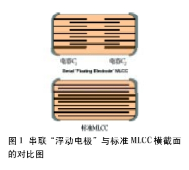 許多年前,人們發(fā)現在空氣中測試500VDC以上的電壓時,MLCC標準設計的性能出現了問題。有效層(active layer)之間的內部擊穿和接線端之間的表面弧導致了故障的出現。為了解決電容器的有效區(qū)(active area)的電壓應力問題,制造商開發(fā)出了一種串聯(lián)“浮動電極”設計,在單個元件內有效集成了2個以上的電容器組。圖1是這類設計與標準MLCC的比較。
