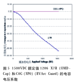 高壓電容器通常是采用X 7 R 和C0G 電解質制造的。這些名稱描述了在-55~+125℃溫度系數將分別為美國電子工業(yè)協(xié)會(EIA)的±15%和±30×10-6/℃。C0G電容器也可以用更常用的術語表示,即NP0(正負零)。不過,值得注意的是,在1kHz條件下以1Vrms進行電容測量非常重要,各種材料可以用這些名稱來描述。對許多電源應用來說,重要的是知道在某個具體電壓下的電容容量。X7R和C0G(NP0)電容器之間存在顯著的差異;施加了DC電壓的X7R電容器將釋放出大量容量,而C0G(NP0)電容仍然沒有太大的變化。出現這種現象是由于與C0G(NP0)電解質的鐵電性質相比,鐵電X 7 R 材料在剩余極化(remnant polarization)方面有根本的不同。實際上,雖然X7R MLCC具有高得多的容量,但是其容量在施加DC電壓時會顯著下降。這方面的一個例子如圖5所示。因此,當采用多層電容器時,設計人員必須考慮到施加電壓下的可用容量。