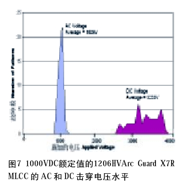 在許多應用中,AC電源處理以及承受AC電壓的能力至關重要。測量這種能力的一種典型方法是在各種高頻條件下施加AC紋波電壓,直到電容器增加到超過環(huán)境溫度20℃以上。不過,在X7R電容器與C0G(NP0)的電容器之間又一次出現了顯著的差異,前者的剩余電偶(remnant dipole)隨著施加的電場移動而引起發(fā)熱,而后者在這種情況下的溫度不會增加。另一個AC 能力指標是通過施加60Hz AC電壓,將其提升至6kV峰值30s 以上,直到發(fā)生電解質擊穿而實現的。這種類型測試的結果可以與對1000VDC額定值的1206 X7R HVArc Guard電容器施加500Vdc/s的破壞測試的DC擊穿電壓相比,如圖7所示。D C 電壓故障的發(fā)生遠遠超過了1000VDC額定值。由于AC電壓故障發(fā)生在1000VAC左右,與DC電壓相比,故障的分布范圍很窄。