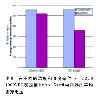 如前面提到的那樣,電容器或電路板涂層可以防止表面弧,而且還可以作為一種防潮的屏障。為了測試HVArc Guard元件對由濕度引起的故障的易感性,對1210外殼尺寸、1000VDC額定值的MLCC樣品進行了擊穿電壓測試,其環(huán)境條件為23.8℃/53.3%RH,提高的溫濕度為85℃/85%RH。其結果如圖8所示。盡管在85/85條件下X7R的平均擊穿電壓相當低,但C0G(NP0)幾乎不受影響。因此,C0G(NP0)看似不那么易受潮濕所引起故障的影響,而兩種情況的擊穿都是在容許范圍以內,即使是在高濕度條件下。兩種環(huán)境條件下測試的元件擊穿范圍均高于額定電壓。