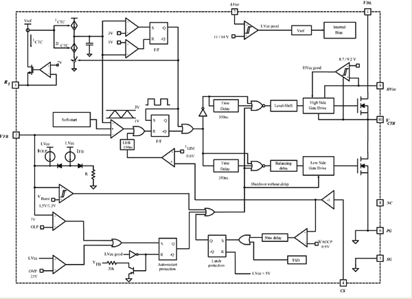 飛兆半導體的集成式“Green FPS”功率開關FSFA2100系列是專門針對不對稱半橋轉換器設計而開發的一種技術。這種技術在單個器件中整合了PWM控制器、高端驅動和SuperFET,只需要極少數量的外部元件。圖3所示為其內部模塊示意圖。在大功率轉換器應用中,PCB版圖設計一向是棘手部分,因為在布局時,為了把噪聲干擾降至最低,必需讓柵極驅動器和控制電路盡可能地靠近MOSFET。FSFA2100把柵極驅動器及控制電路與MOSFET集成在一起,使這些器件之間的距離最小化,從而大幅減小了終端應用的噪聲干擾。此外,這樣做也減少了寶貴的設計時間,使生產力得以提高。