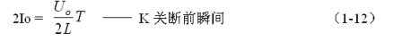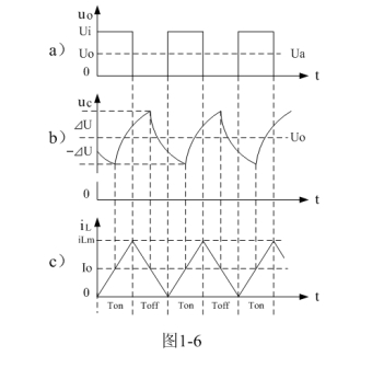 圖1-6是串聯(lián)式開關(guān)電源工作于臨界連續(xù)電流狀態(tài)時,串聯(lián)式開關(guān)電源電路中各點電壓和電流的波形。圖1-6中,Ui為電源的輸入電壓,uo為控制開關(guān)K的輸出電壓,Uo為電源濾波輸出電壓,iL為流過儲能濾波電感電流,Io為流過負(fù)載的電流。圖1-6-a)是控制開關(guān)K輸出電壓的波形;圖1-6-b)是儲能濾波電容C的充、放電曲線圖;圖1-6-c)是流過儲能濾波電感電流iL的波形。當(dāng)串聯(lián)式開關(guān)電源工作于臨界連續(xù)電流狀態(tài)時,控制開關(guān)K的占空比D等于0.5,流過負(fù)載的電流Io等于流過儲能濾波電感最大電流iLm的二分之一。