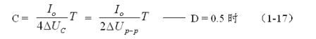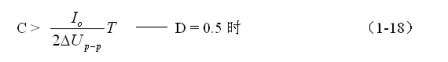 (1-17)和(1-18)式,就是計算串聯(lián)式開關(guān)電源儲能濾波電容的公式(D = 0.5時)。式中:Io是流過負(fù)載的電流,T為控制開關(guān)K的工作周期,ΔUP-P為輸出電壓的波紋。電壓波紋ΔUP-P一般都取峰-峰值,所以電壓波紋正好等于電容器充電或放電時的電壓增量,即:ΔUP-P = 2ΔUc 。