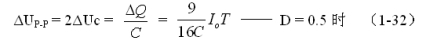 (1-33)和(1-34)式,就是計算反轉式串聯開關電源儲能濾波電容的公式(D = 0.5時)。式中:Io是流過負載電流的平均值,T為開關工作周期,ΔUP-P為濾波輸出電壓的波紋,或電壓紋波。一般波紋電壓都是取電壓增量的峰-峰值,因此,當D = 0.5時,波紋電壓等于電容器充電的電壓增量,即:ΔUP-P = 2ΔUc 。