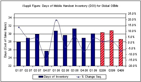 第三季度,iSuppli公司預(yù)測手機(jī)市場將恢復(fù)增長,銷售額將比第二季度上升7.8%。這種增長主要來源于訂單增加,此前訂單接近停滯。另外,庫存將上升5%左右。iSuppli公司預(yù)測,需求與庫存的相應(yīng)增長將使庫存天數(shù)保持在30天左右。