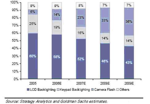 可拍照手機有取代傳統中低端數碼相機的趨勢,并且消費者期望能夠在低光照亮度的條件下拍攝高質量的照片,因而采用Flash LED作為閃光燈是提高數碼相機性能的重要措施。Flash LED的光學特性決定它既可以作為拍照的閃光應用,也可以用于視頻拍攝時補光,甚至是用于照明的電筒應用。因此Flash LED在手機中的應用將會越來越普遍,表1為Flash LED作為閃光燈在手機LED應用中的比例走勢。