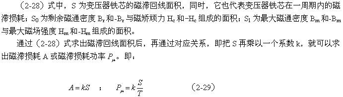 由(2-21)、(2-22)、(2-23)、(2-24)、(2-25)、(2-26)式可知,如要計算變壓器鐵芯的磁滯損耗,只需要計算變壓器鐵芯磁滯回線面積的大小,然后通過它們的對應關系,就可以求出變壓器鐵芯的磁滯損耗。